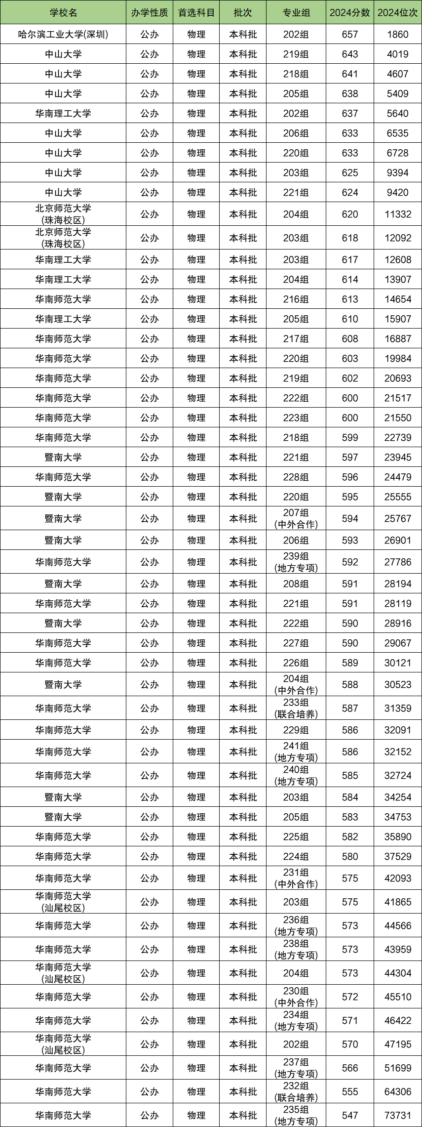 下文为2024年广东省211大学在广东物理类录取分数线和位次排名表,供大家参考: