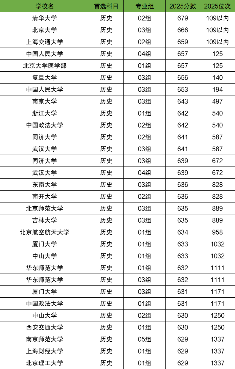 在江苏历史等科目类中,收分最高的大学为清华大学02专业组,2025年录取最低分为679分,超过本科批次线197分;此外收分在650分以上大学还包含北京大学03专业组、上海交通大学02专业组、中国人民大学04专业组、北京大学医学部01专业组、复旦大学03专业组等。