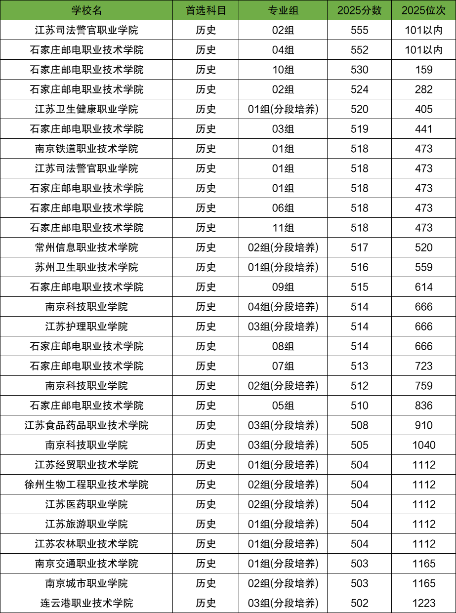 2025年江苏省历史科目类专科高校录取分数线一览表(前30强):