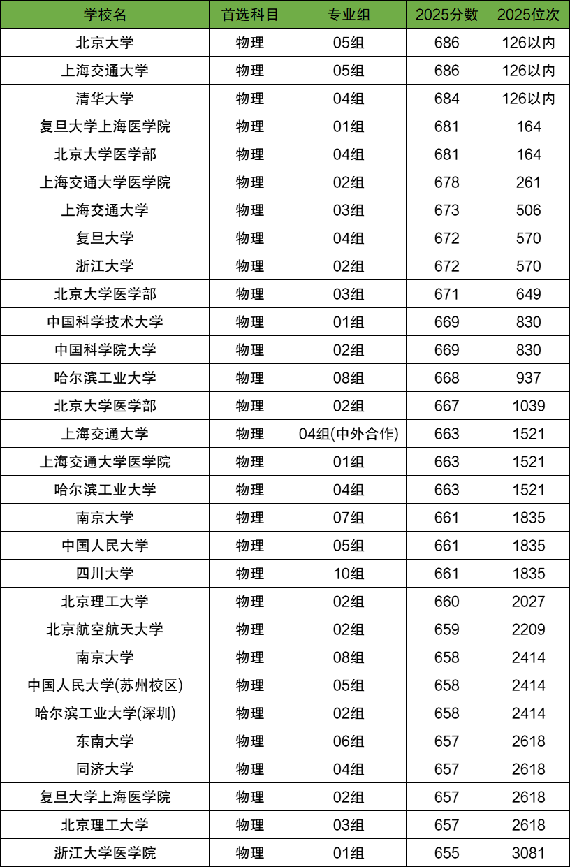 在江苏物理等科目类中,收分较高的大学为北京大学05专业组、上海交通大学05专业组、清华大学04专业组,2025年录取最低分都超过了680分,超过本科批次线221分到223分;此外收分超过670分的大学还包含上海交通大学医学院02专业组、上海交通大学03专业组、复旦大学04专业组、浙江大学02专业组等。