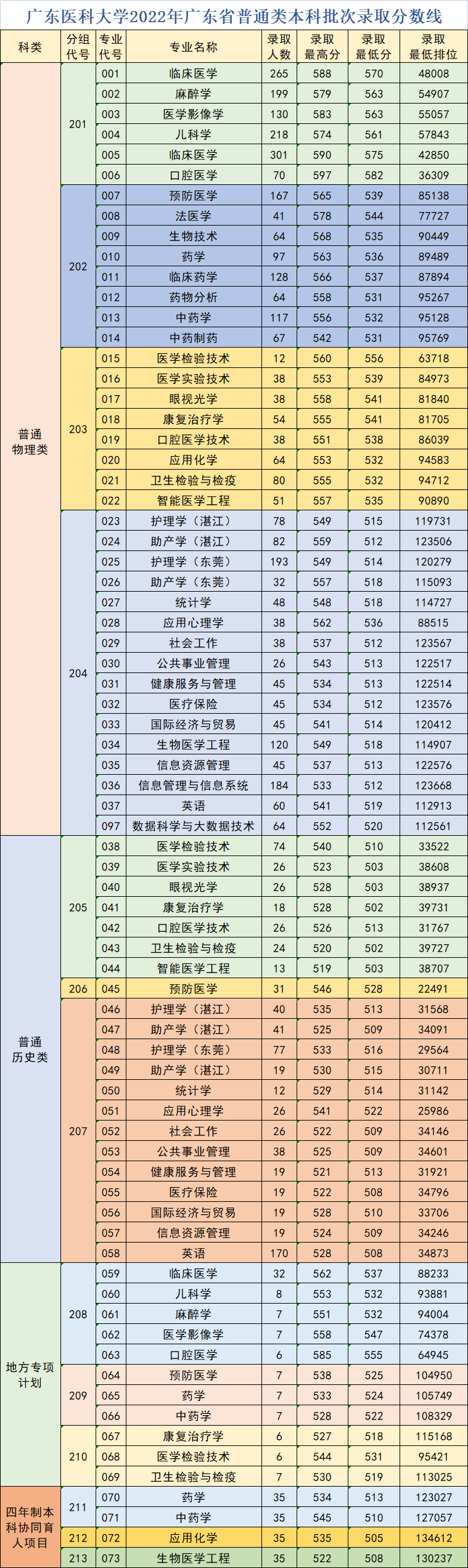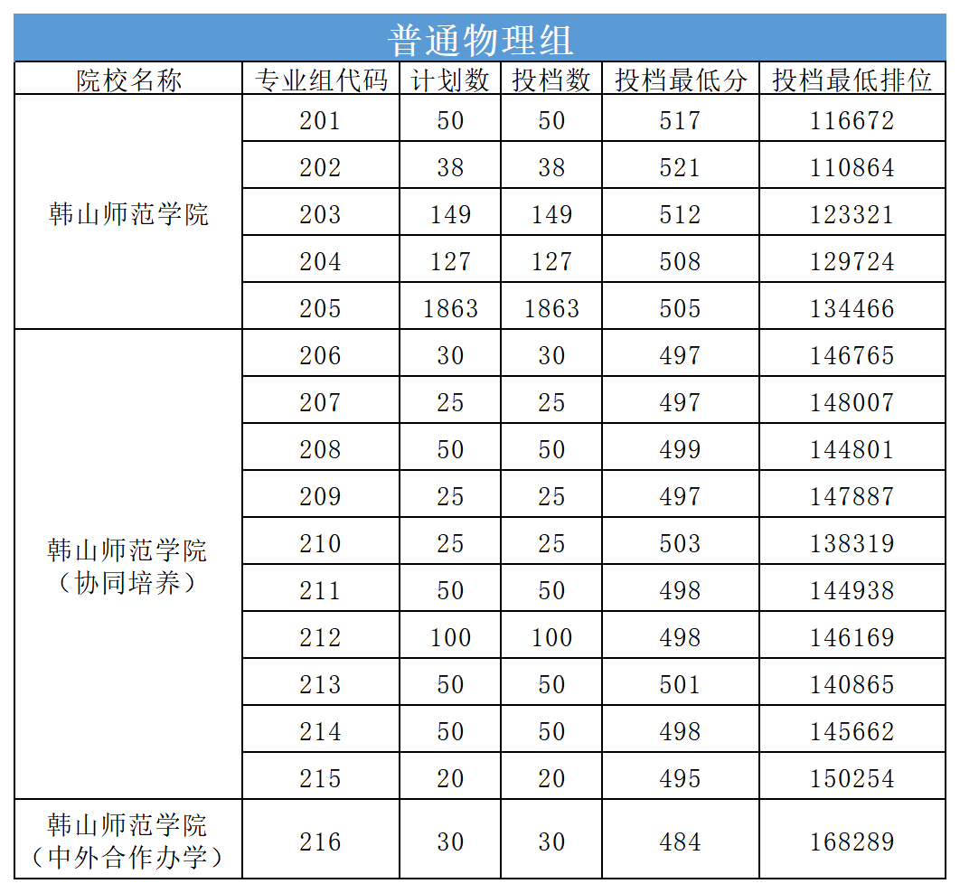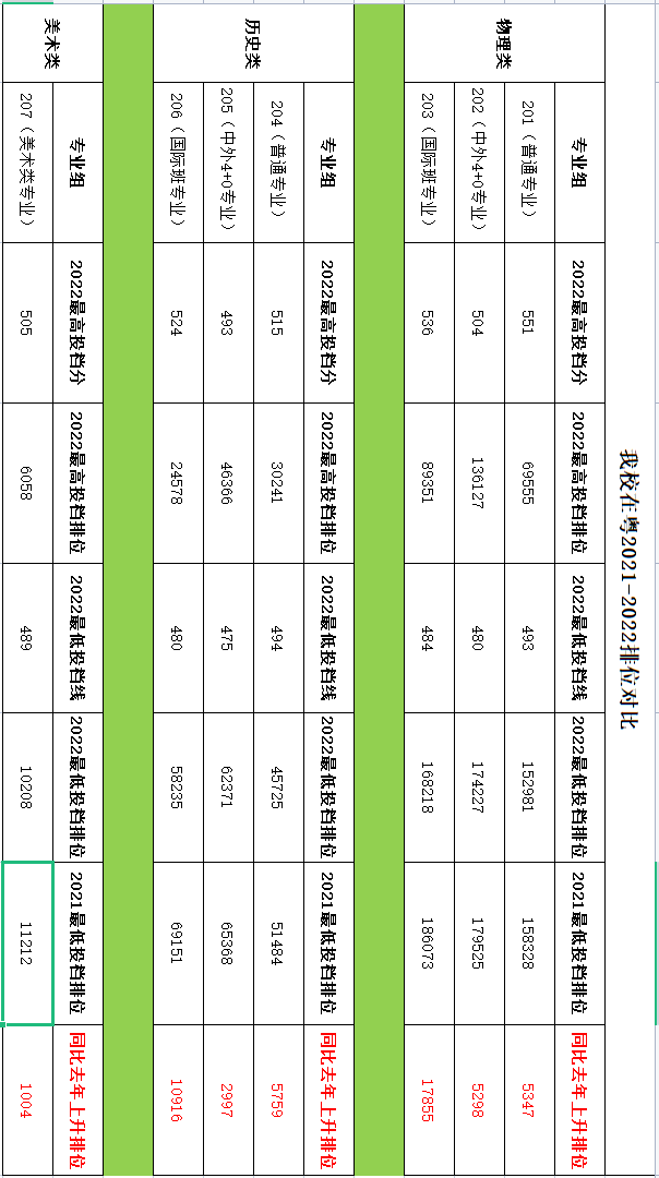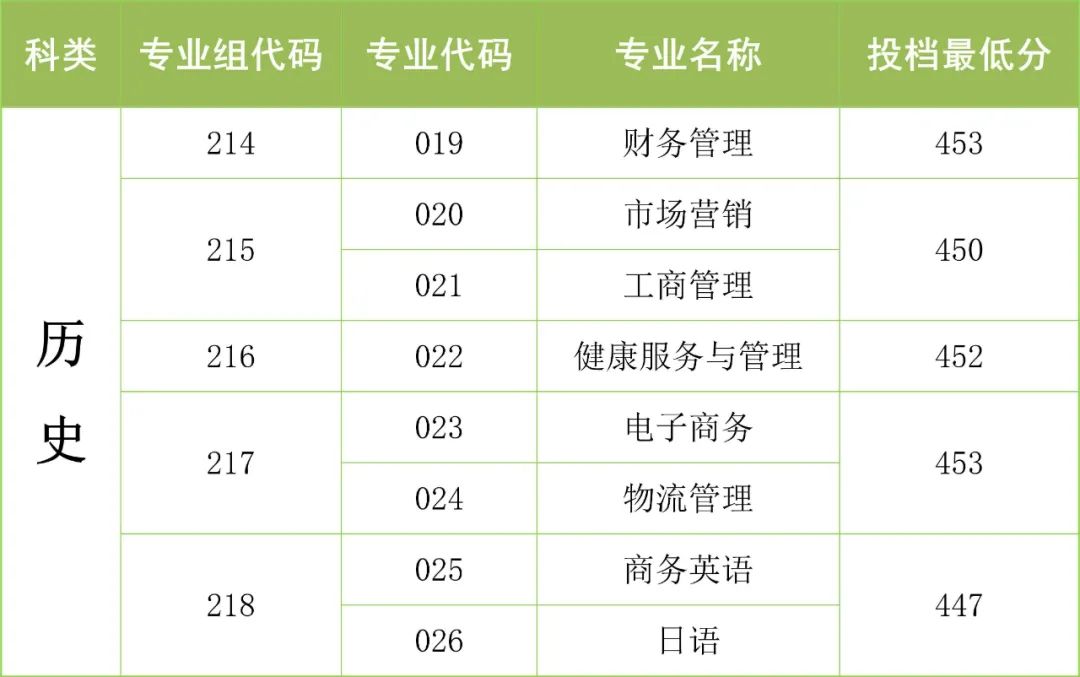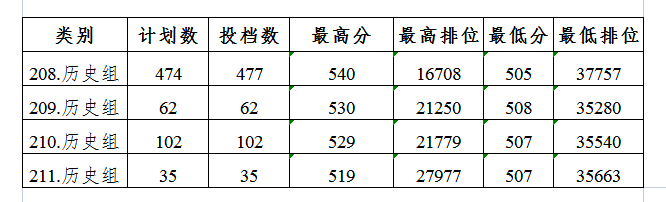 普通类(历史)202专业组443/94310;普通类(物理)201专业组456/215280;美术203专业组450/21993;音乐204专业组457/4911;舞蹈205专业组405/1728。