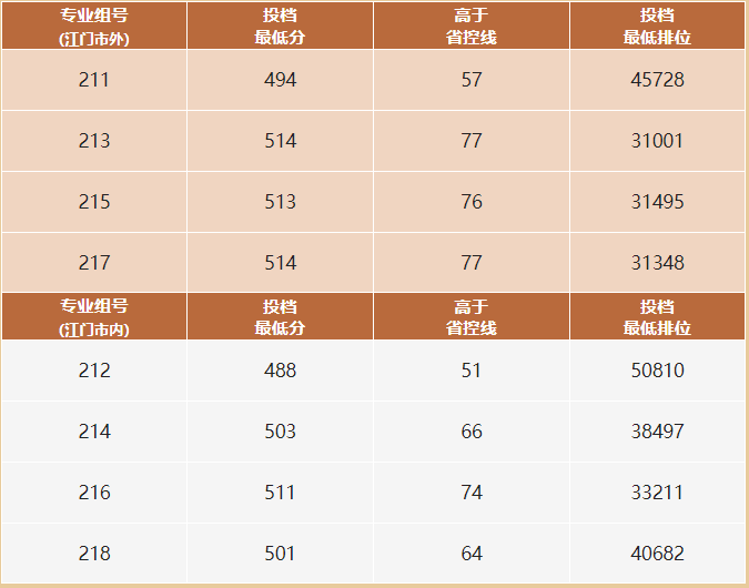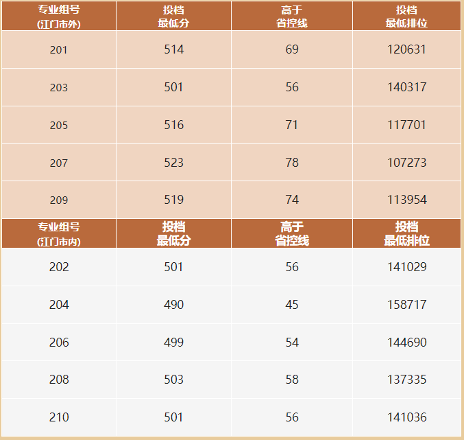 历史类201专业组最高投档分526,最低投档分437;物理类202专业组最高投档分497,最低投档分445;美术类203专业组最高投档分475,最低投档分441;物理类204专业组最高投档分505,最低投档分446。