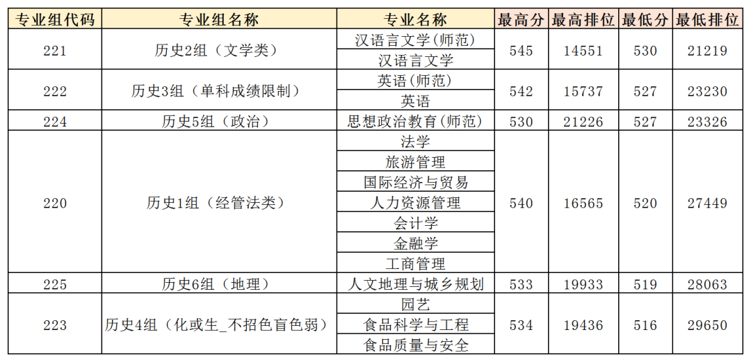 历史类4个专业组,投档线分别为201组609、202组604、218组606、219组602,最低位次1433名。