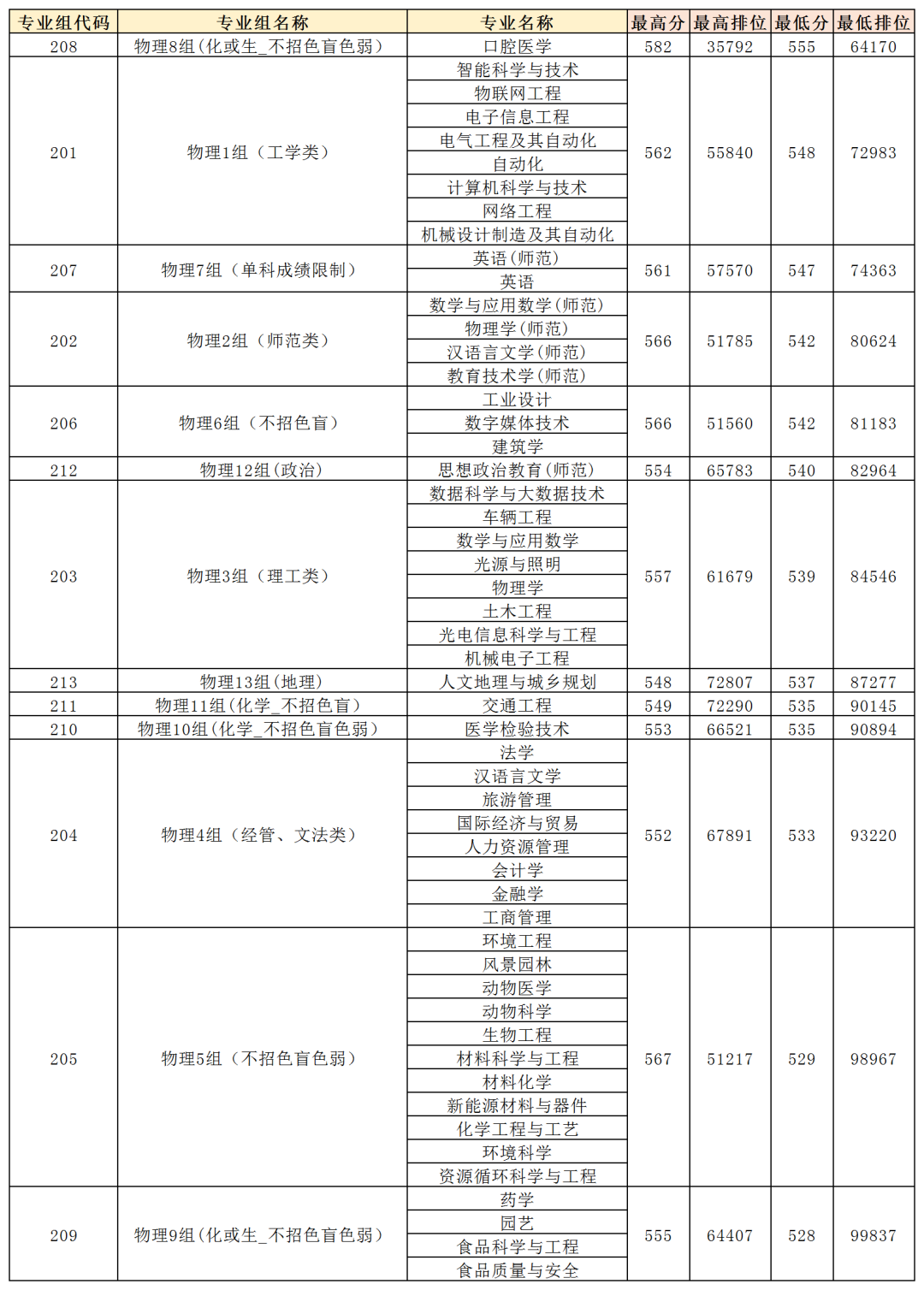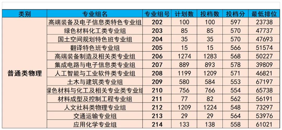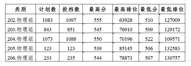 物理类10个专业组,投档线分别为203组636,204组629,205组662,208组659,209组636,210组614,211组627,212组627,220组633,221组631,有9个专业组考生位次100%在7千多名以内,全校所有理科专业组97%的位次在7千多名以内。