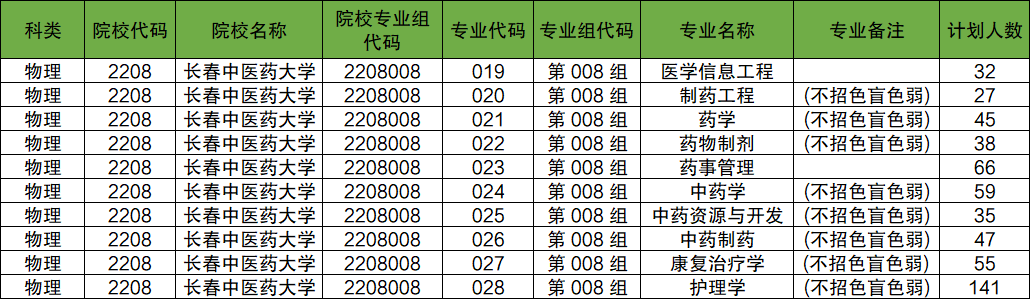 第008组:专业组代码为2208008,包含专业有医学信息工程、制药工程、药学、药物制剂、药事管理、中药学、中药资源与开发、中药制药、康复治疗学、护理学。
