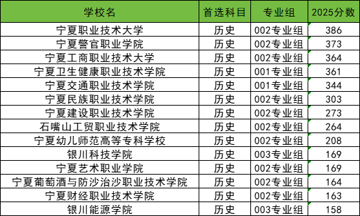 下面是2025年宁夏回族自治区内专科高校历史类录取分数线一览表: