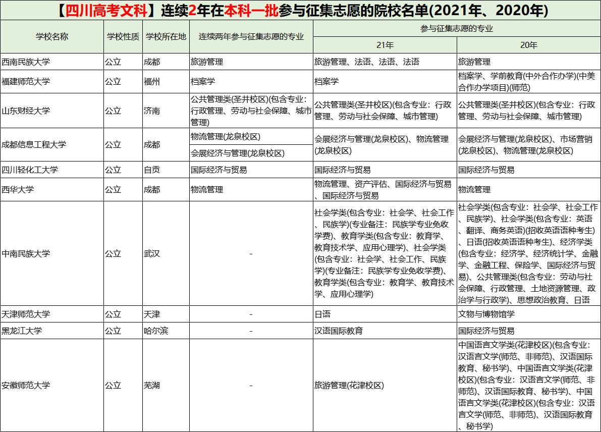 ③、连续2年在四川文科进行一本征集志愿的大学及专业名单