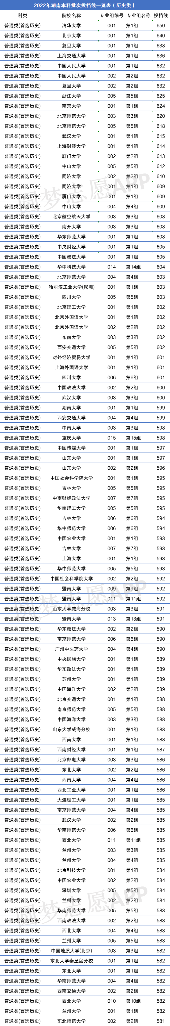 在湖南历史录取分数线TOP100的院校专业组中,这100个院校专业组的投档线在581-650分之间,超过了本科线130-199分。其中录取分数线最高的是清华大学(001)650分,录取分数线最低的是东北师范大学(002)581分。