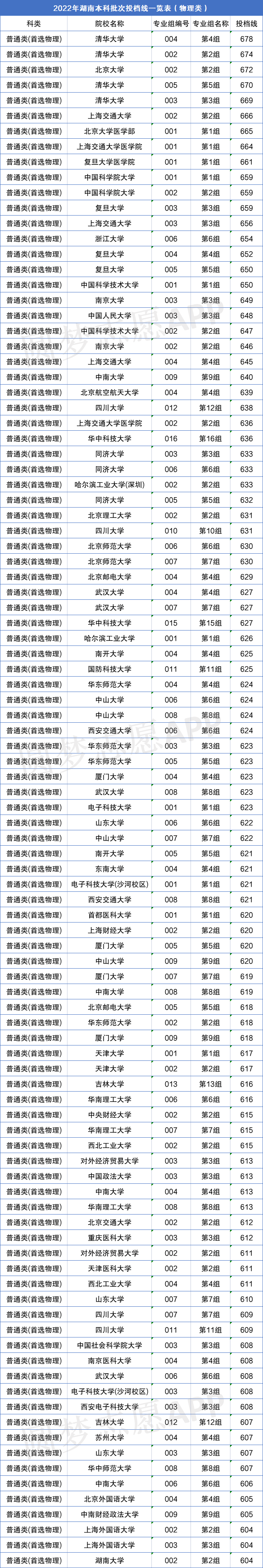 在湖南物理录取分数线TOP100的院校专业组中,这100个院校专业组的投档线在604-678分之间,超过了本科线190-264分。其中录取分数线最高的是清华大学(004)678分,录取分数线最低的是湖南大学(002)604分。