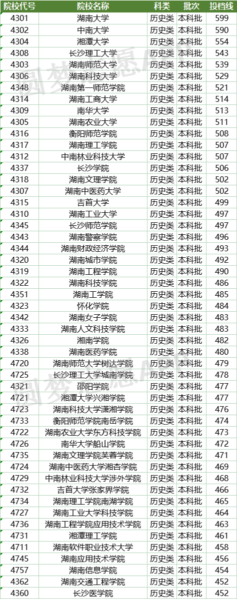 1、湖南省内历史类分数最高的本科大学为湖南大学,录取分数线为599分,录取位次为34872、湖南省内历史类分数最低的本科大学为长沙医学院、湖南交通工程学院,录取分数线为452分,录取位次为138648