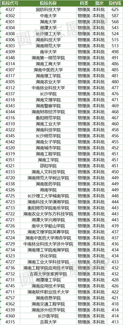 3、湖南省内物理类分数最高的本科大学为国防科技大学,录取分数线为625分,录取位次为1408094、湖南省内物理类分数最低的本科大学为吉首大学、长沙医学院、湖南涉外经济学院,录取分数分别为413分、414分、414分,录取位次为204270。