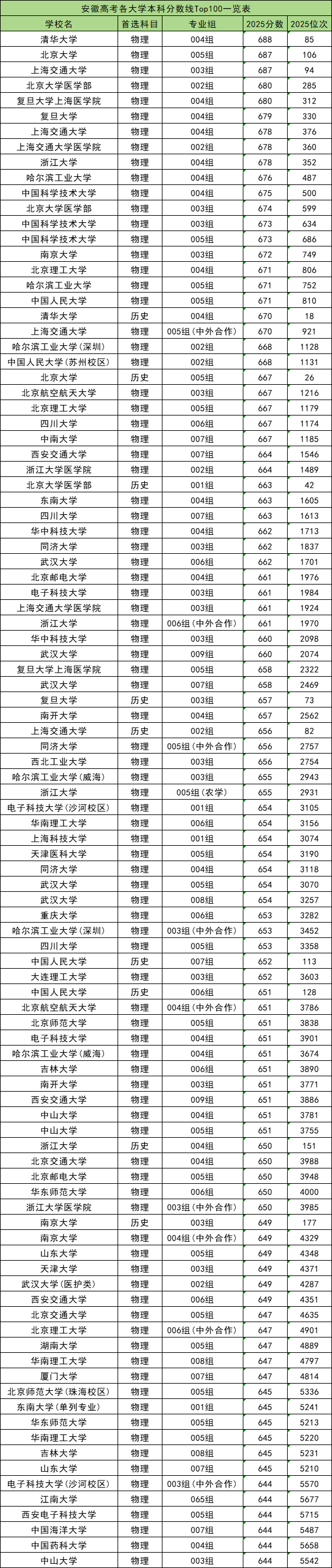 上述列举均为2025年安徽本科投档录取分数线最低的大学,适合2026届低分考生捡漏。而高分院校中,清华大学004组以688分的高分占据物理类高分榜第一,清华大学004组以670分的高分占据历史类高分榜第一。