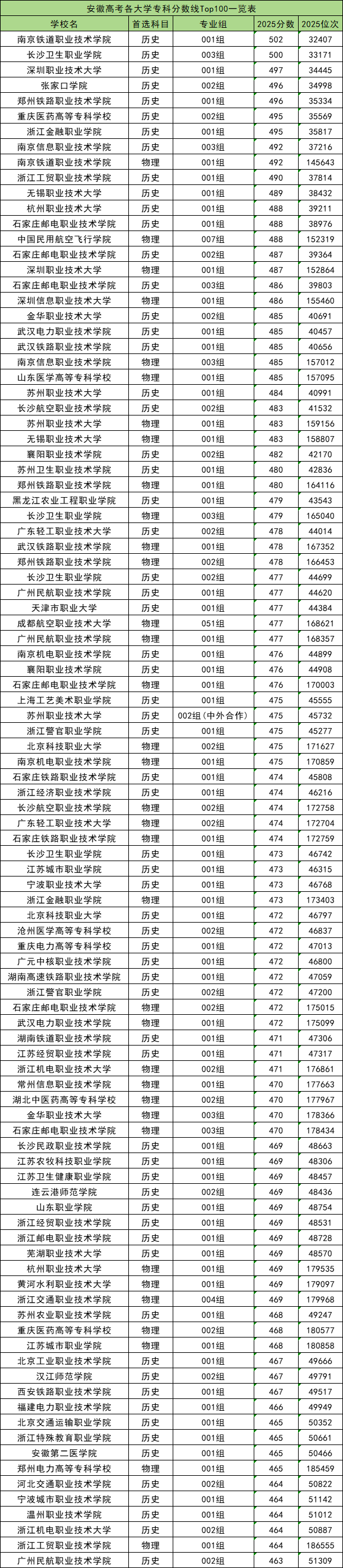 上述列举均为2025年安徽专科投档录取分数线最低的大学,适合2026届低分考生捡漏。而高分院校中,南京铁道职业技术学院001组以502分的高分占据历史类高分榜第一,南京铁道职业技术学院001组以492分的高分占据物理类高分榜第一。