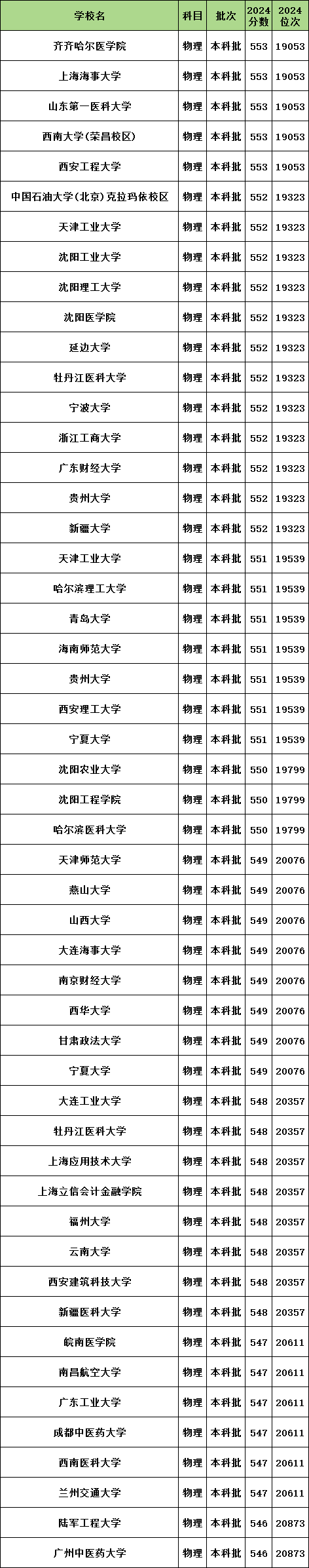 黑龙江高考物理类2万名左右能报考的大学中位次排名较低的是陆军工程大学、广州中医药大学,2024年最低分546分,对应排名是20873名。另外最接近2万名的是天津师范大学、燕山大学、山西大学、大连海事大学,2024年最低分549分,排名是20076名。