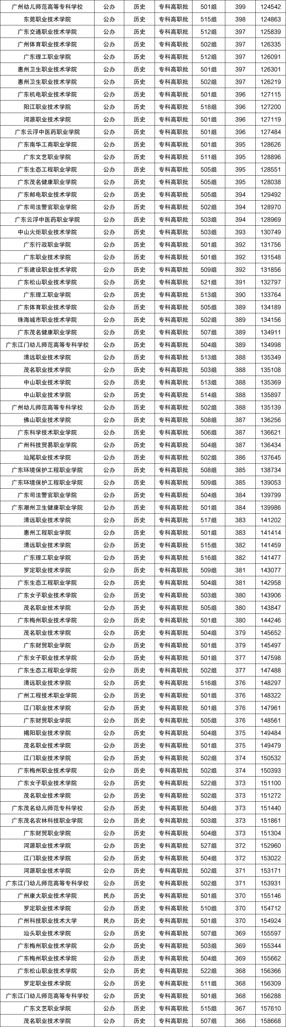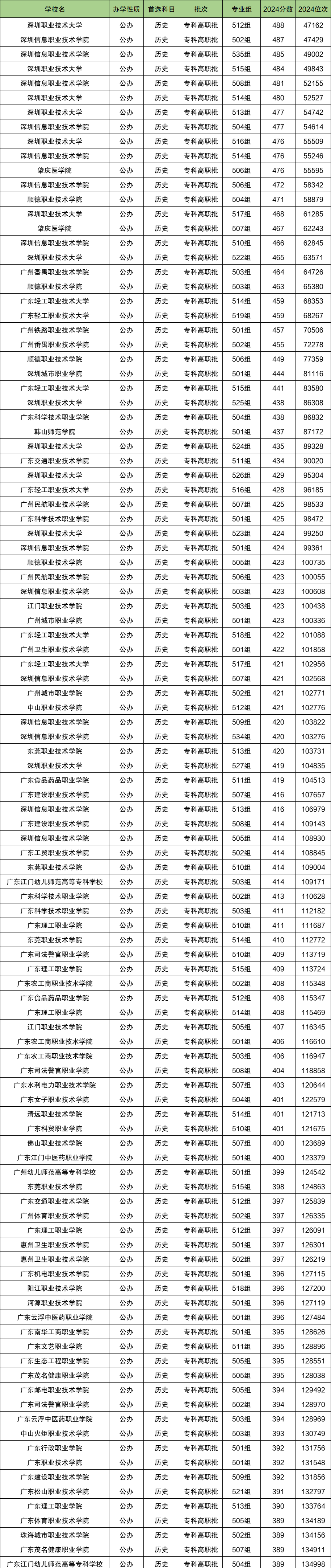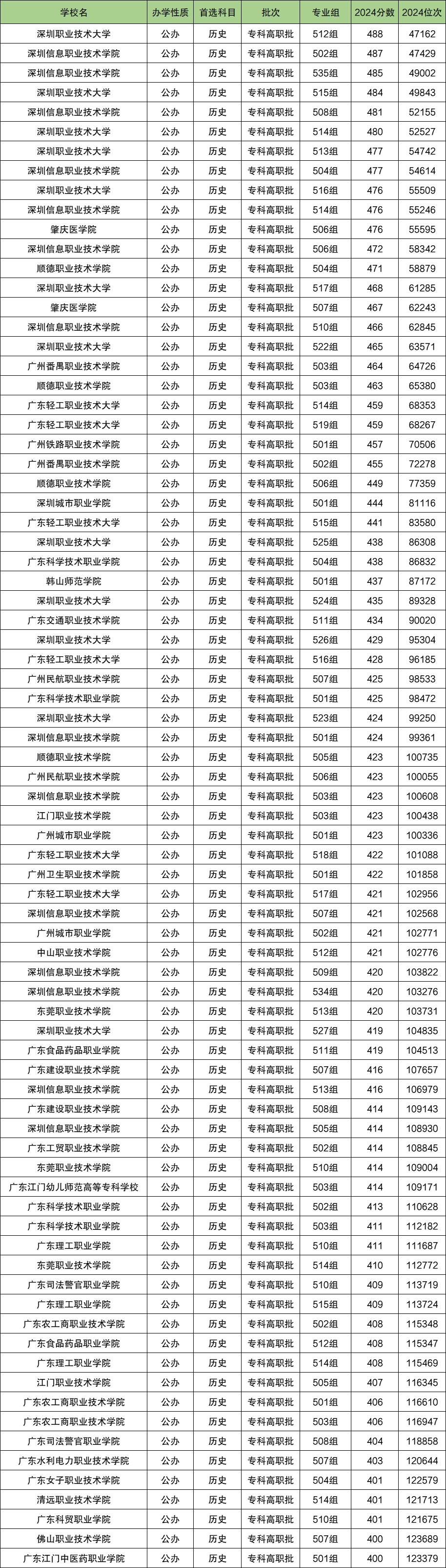 下文为2024年广东省专科大学在广东历史类录取分数线和位次排名表,供大家参考:
