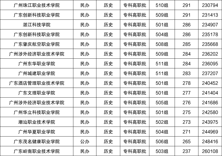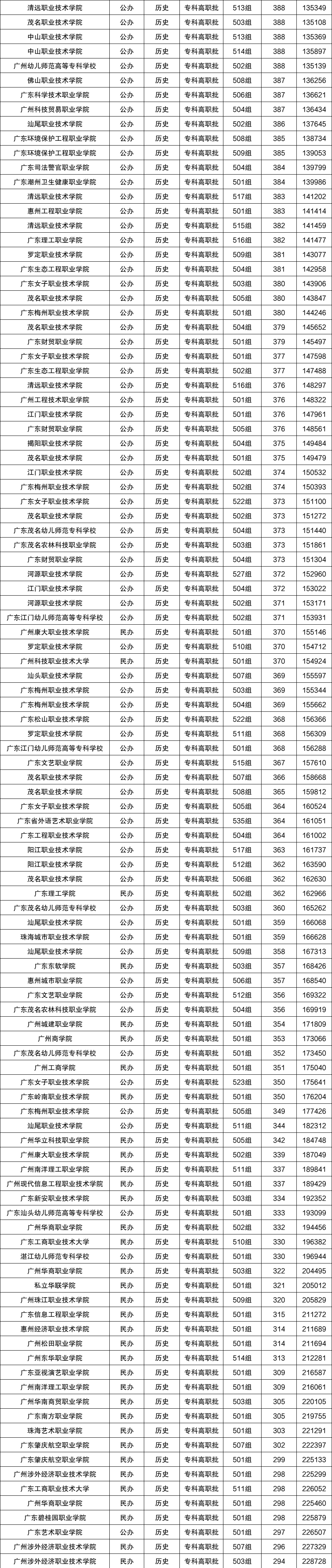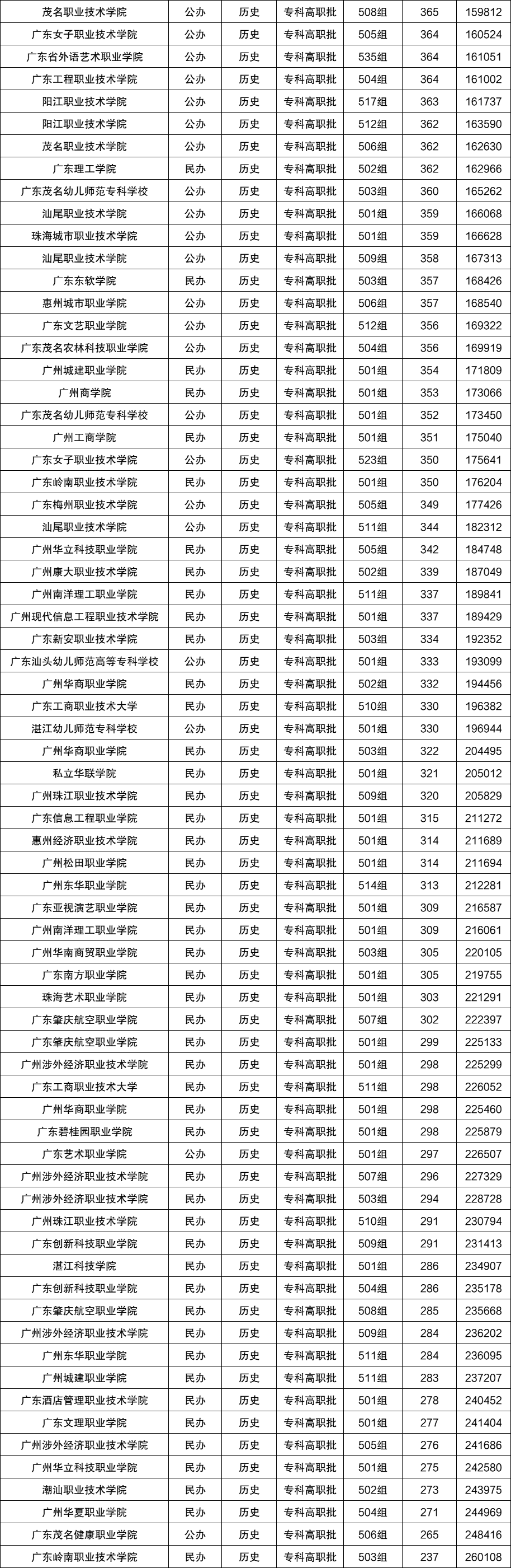 下文为2024年广东省专科大学在广东历史类录取分数线和位次排名表,供大家参考: