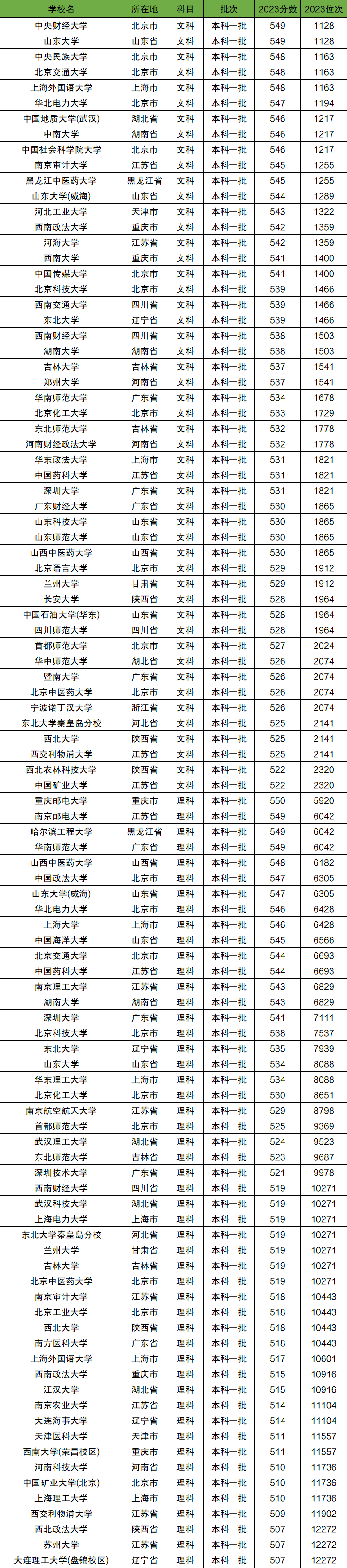 下表为2023年全国大学在内蒙古高考中,录取分数在500分左右的大学名单。