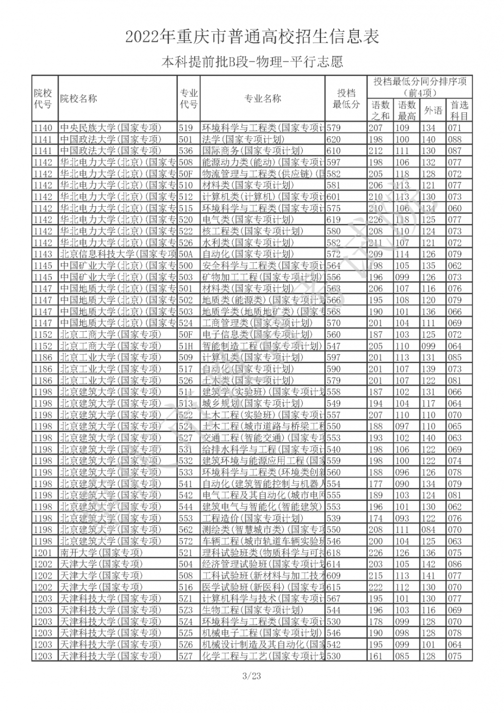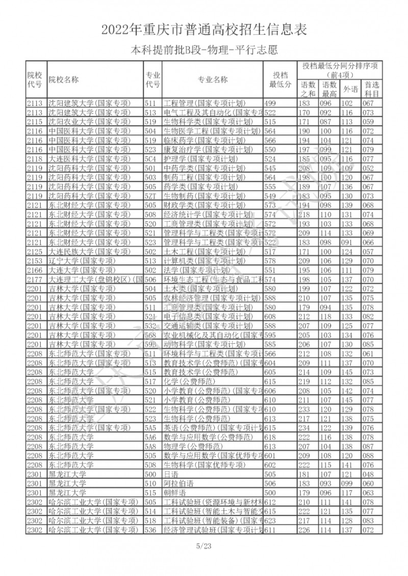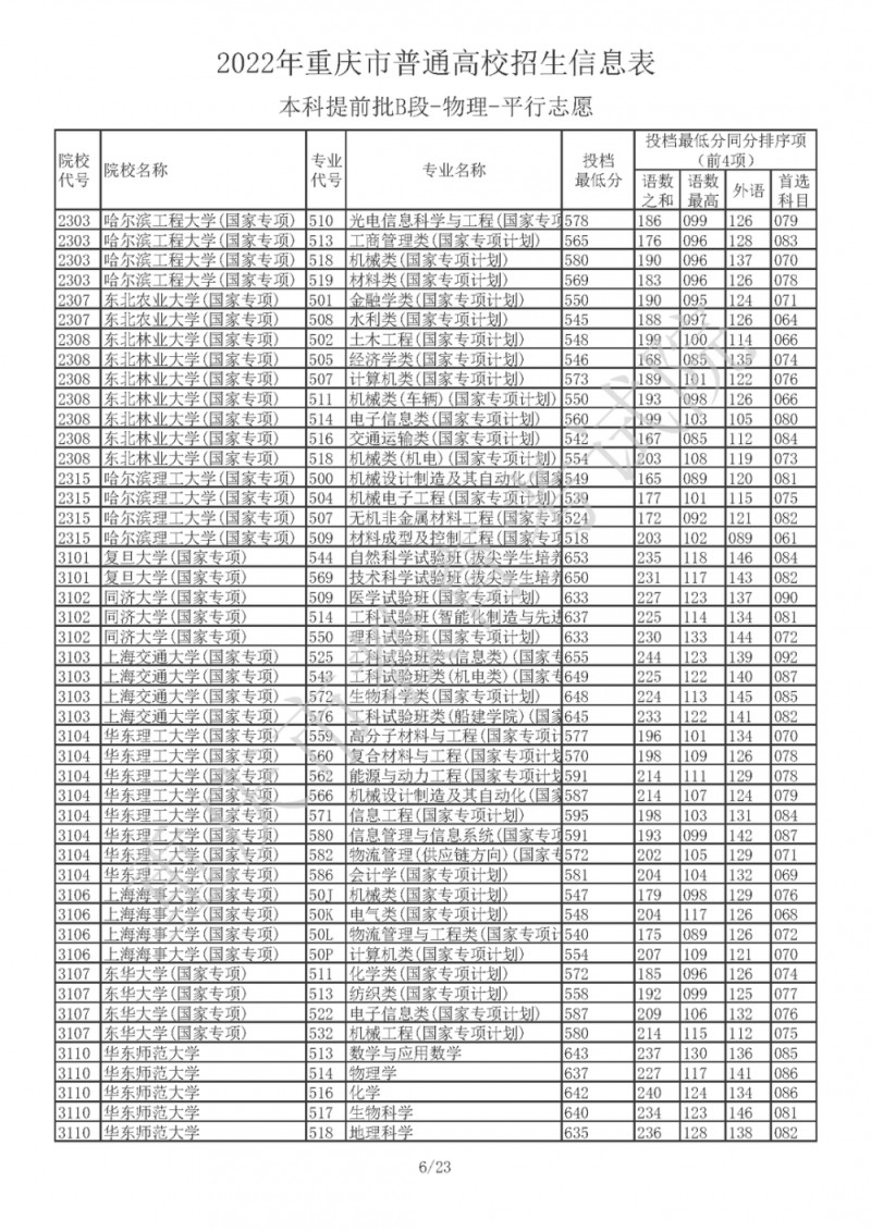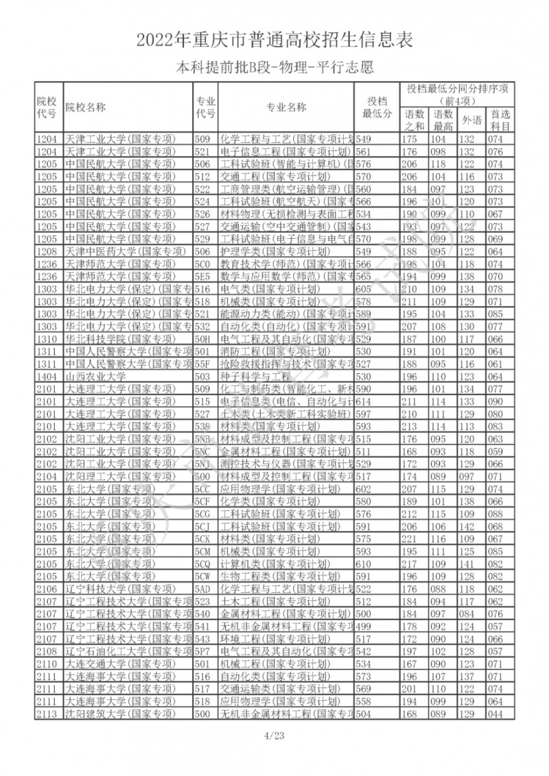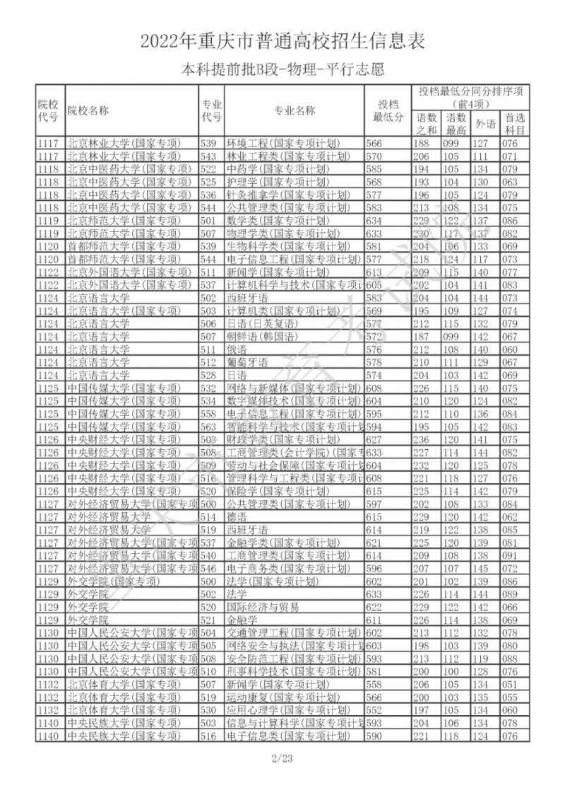 2022年重庆市普通高校招生信息表(本科提前批B段-物理-平行志愿)