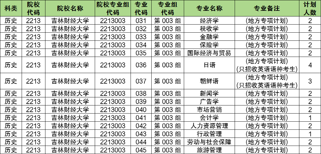 第003组:专业组代码为2213003,包含专业经济学、税收学、金融学、保险学、国际经济与贸易、日语、朝鲜语、新闻学、广告学、市场营销、会计学、人力资源管理、行政管理、劳动与社会保障、旅游管理。