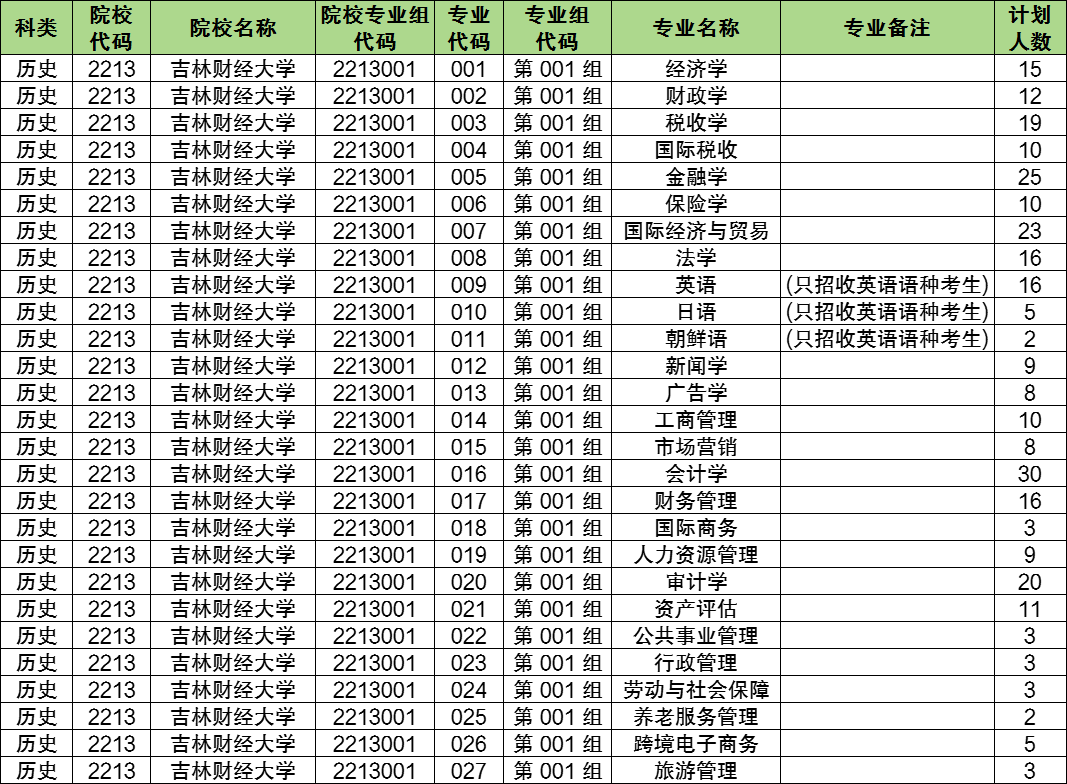 第001组:专业组代码为2213001,包含专业经济学、财政学、税收学、国际税收、金融学、保险学、国际经济与贸易、法学、英语、日语等。