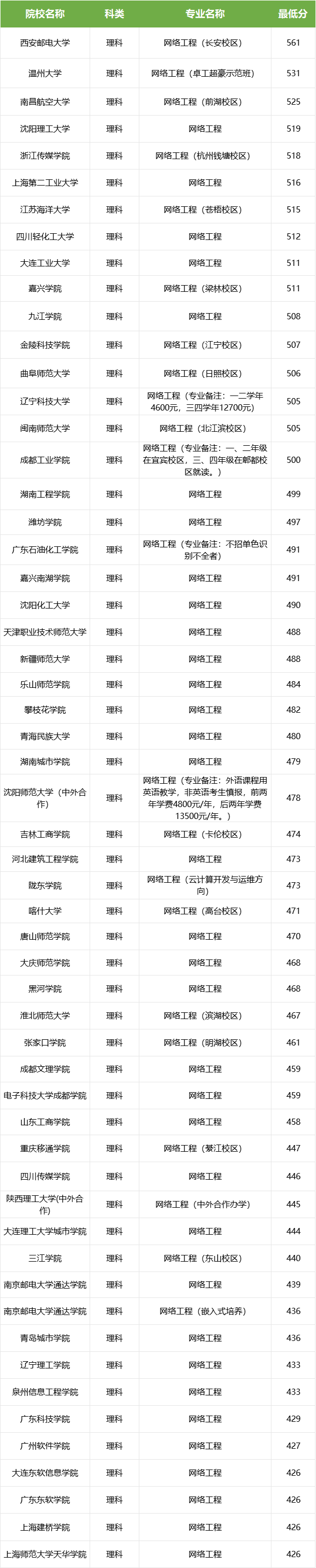 二本批次中网络工程专业分数最高的是西安邮电大学、温州大学、南昌航空大学。