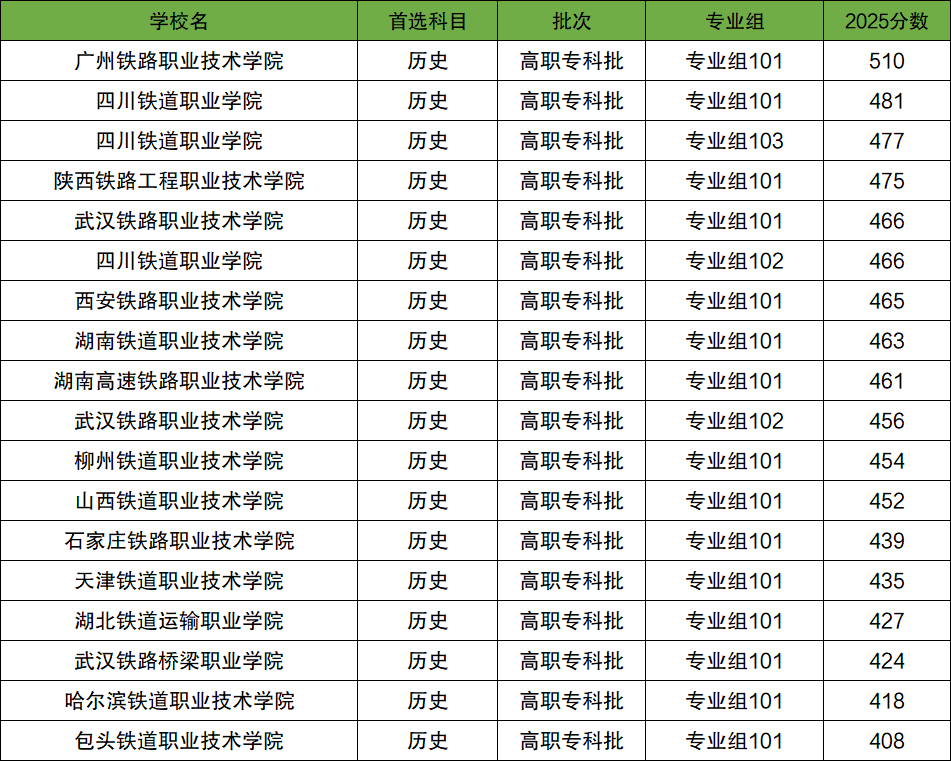其中最低分院校为包头铁道职业技术学院,2025年最低分为408分。最高分院校为广州铁路职业技术学院,2025年最高分为510分。