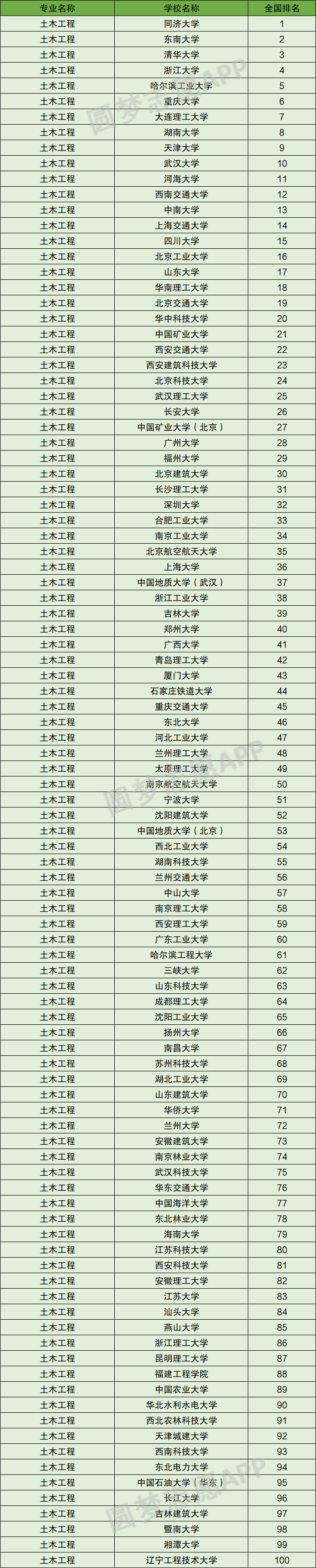 以下为软科中国大学专业排名中,土木工程专业前100名大学。