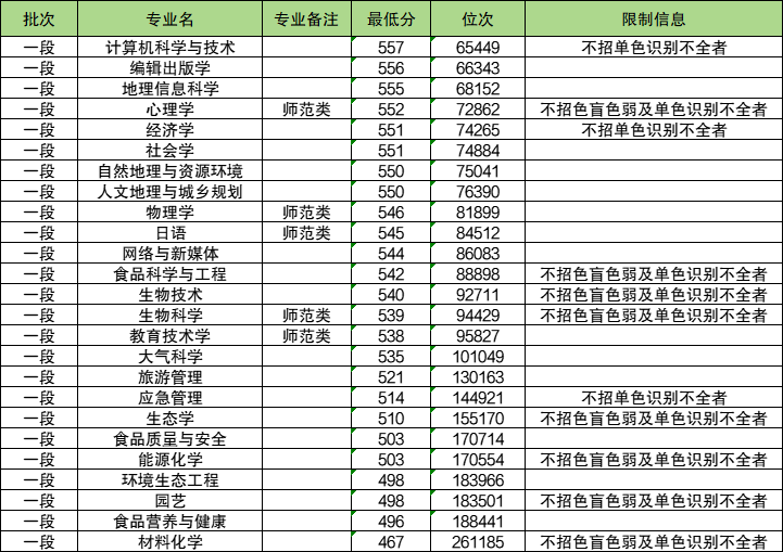 地理科学专业(师范类):最低563分。不招色盲及单色识别不全者。