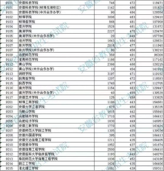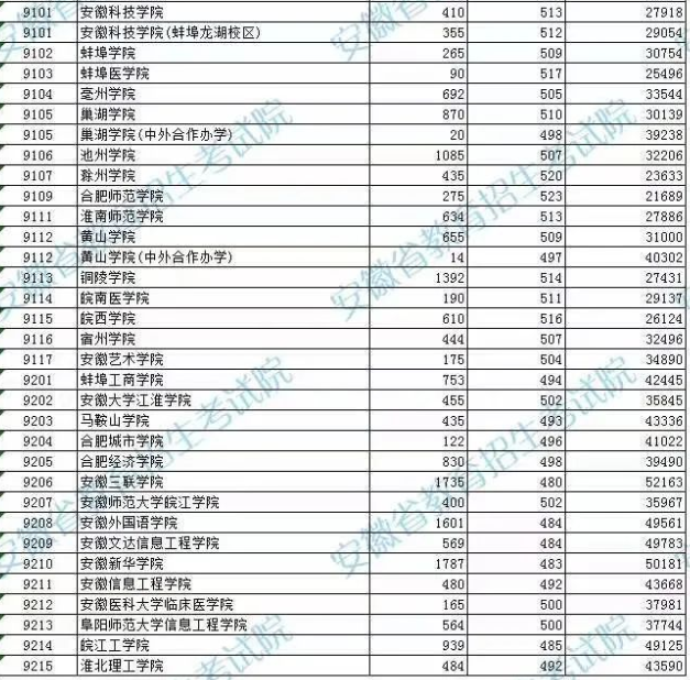 2、安徽省内文科分数最低的二本大学为安徽三联学院,最低分数线为480分,录取位次为43668,其次为安徽外国语学院、安徽文达信息工程学院,为484分。