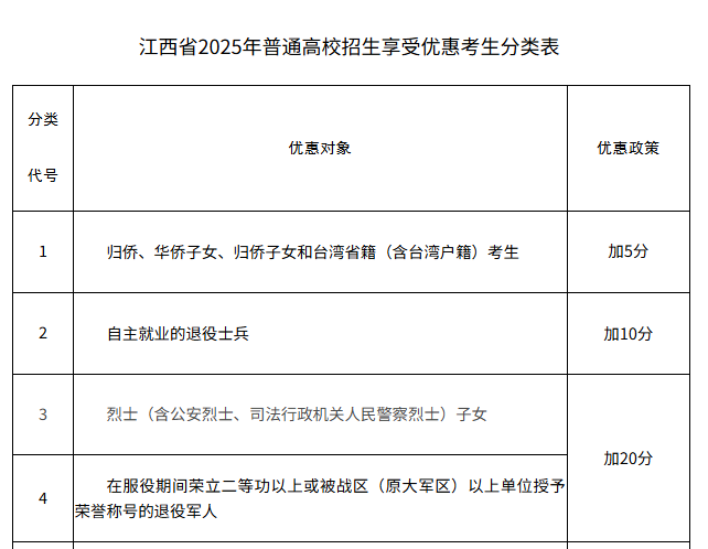 江西高考加分政策最新规定显示:烈士子女加20分、自主就业的退役士兵加10分等,详细加分项目可在正文查阅。