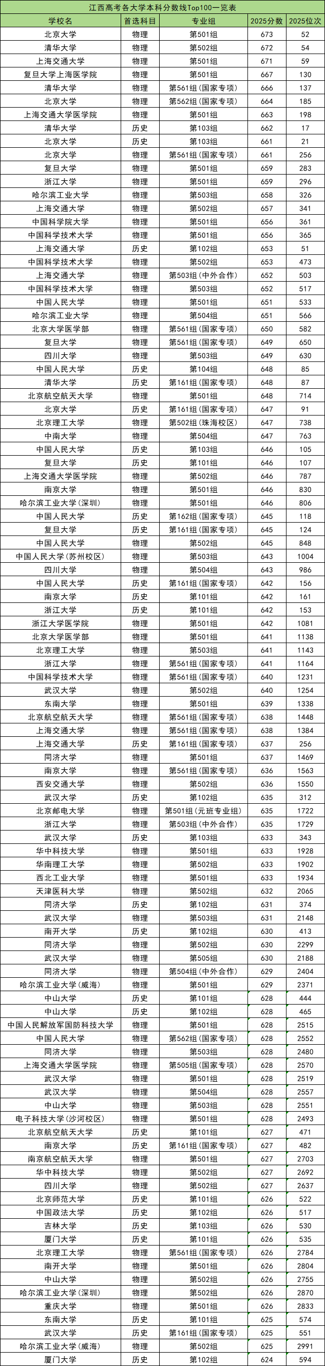 上述列举均为2025年江西本科投档录取分数线最低的大学,适合2026届低分考生捡漏。而高分院校中,北京大学第501组以673分的高分占据物理类高分榜第一,清华大学第103组以662分的高分占据历史类高分榜第一。