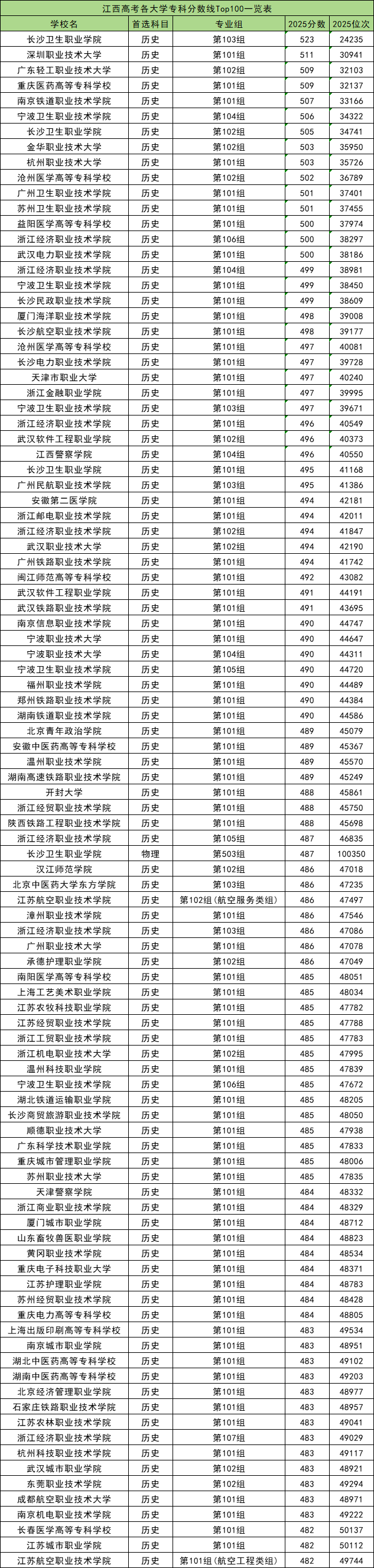 上述列举均为2025年江西专科投档录取分数线最低的大学,适合2026届低分考生捡漏。而高分院校中,长沙卫生职业学院第103组以523分的高分占据历史类高分榜第一,长沙卫生职业学院第503组以487分的高分占据物理类高分榜第一。