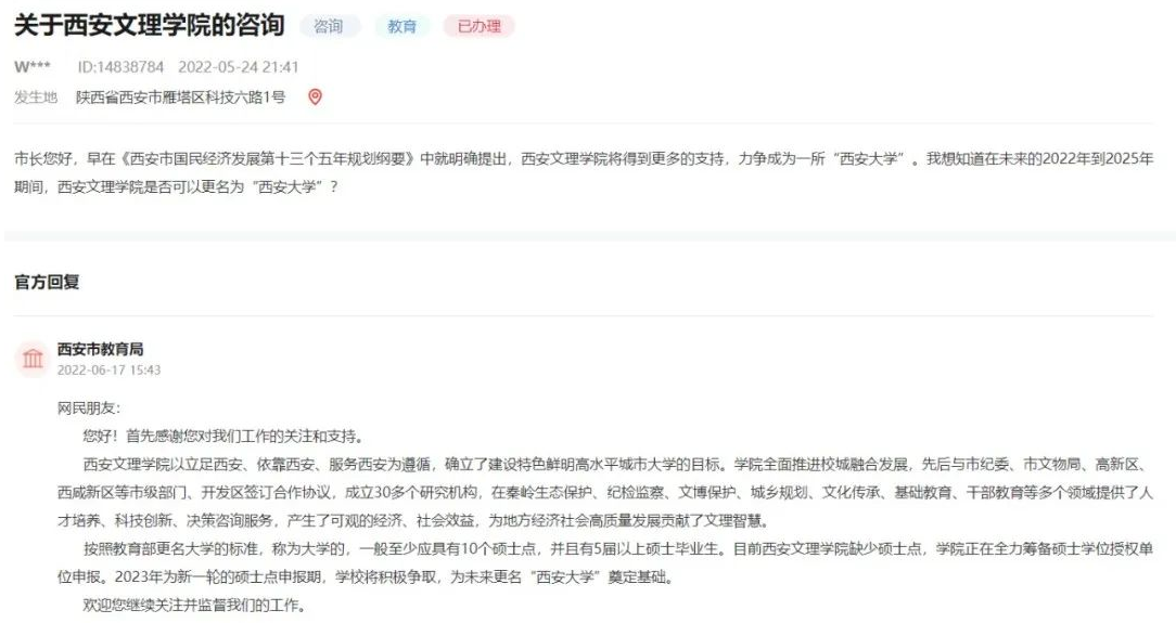 起因在于网友在人民网领导留言板询问该校未来会否易名为“西安大学”,成为另一所以省会城市直接命名的大学。