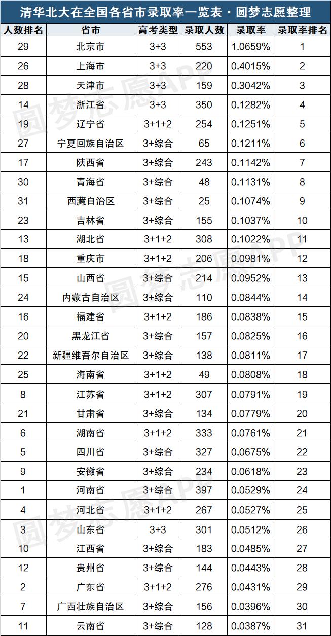 2. 上海市:上海市是我国经济最发达的城市之一,清华北大在上海的录取率达到0.4015%。