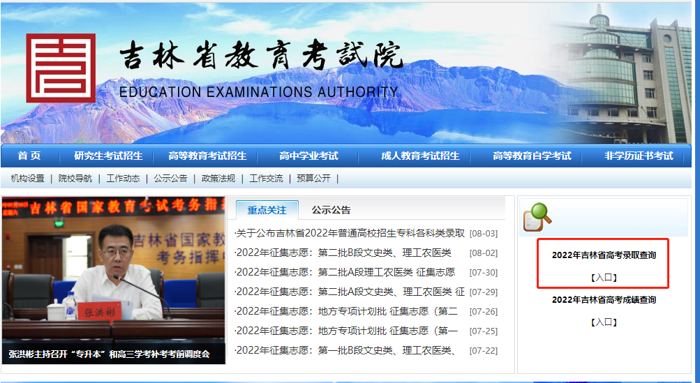 录取结果查询网址及入口:http://www.jleea.edu.cn/
