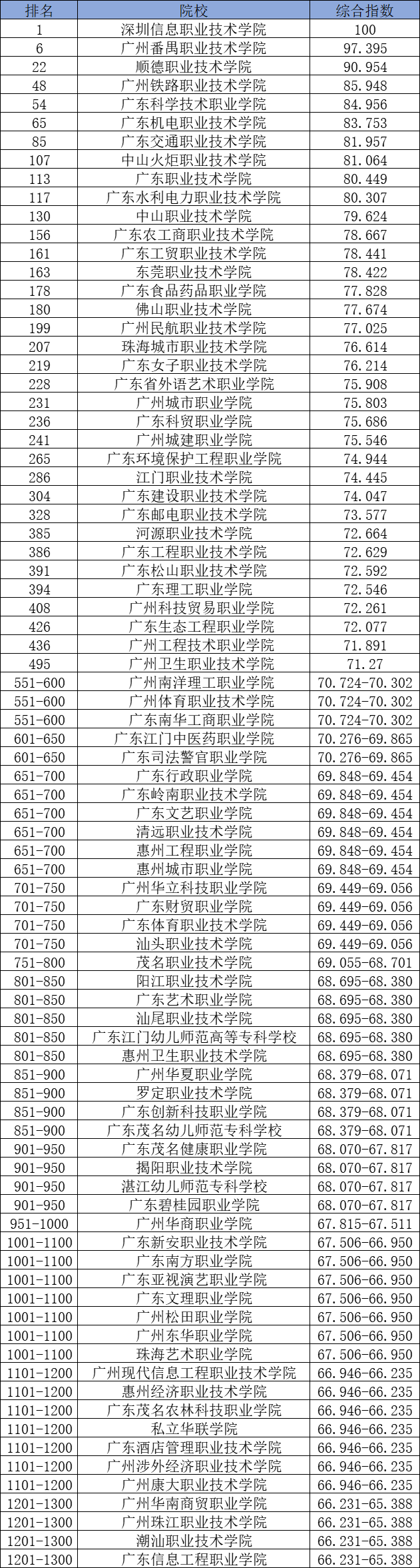 广东大专院校排名如下:深圳信息职业技术学院(全国第1名)、广州番禺职业技术学院(全国第6名)、顺德职业技术学院(全国第22名)等。
