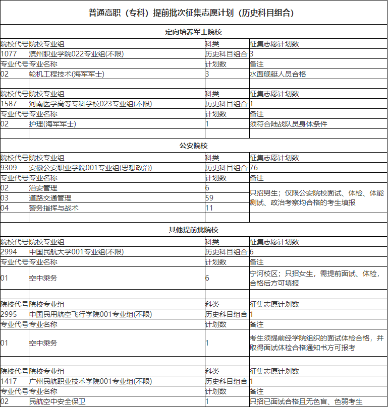 2025普通高职(专科)提前批次征集志愿计划(历史科目组合)
