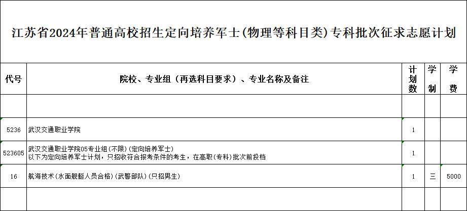 2024年江苏专科提前批征集志愿院校名单只有武汉交通职业学院1所,招生专业为航海技术。