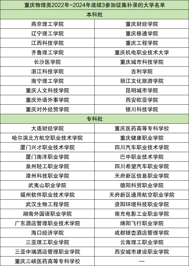 如果一所院校在近三年均参加了征集补录,那么2025年也有很大概率会参加。篇幅有限,这里我们以重庆市物理类招生院校为例,为大家列举2022年-2024年连续参加征集补录的大学名单。