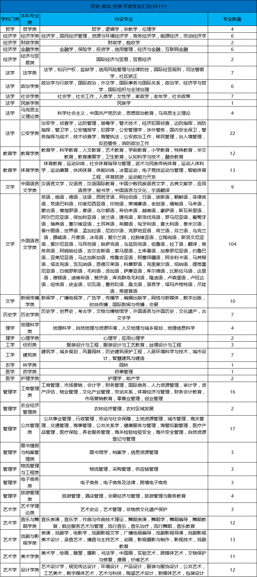 历政生组合在高考选科中提供了广泛的选择空间,能够报考的学科门类几乎涵盖了全部的12个,在具体专业数量上,历政生组合可报考的专业数量相当可观,约为341个。