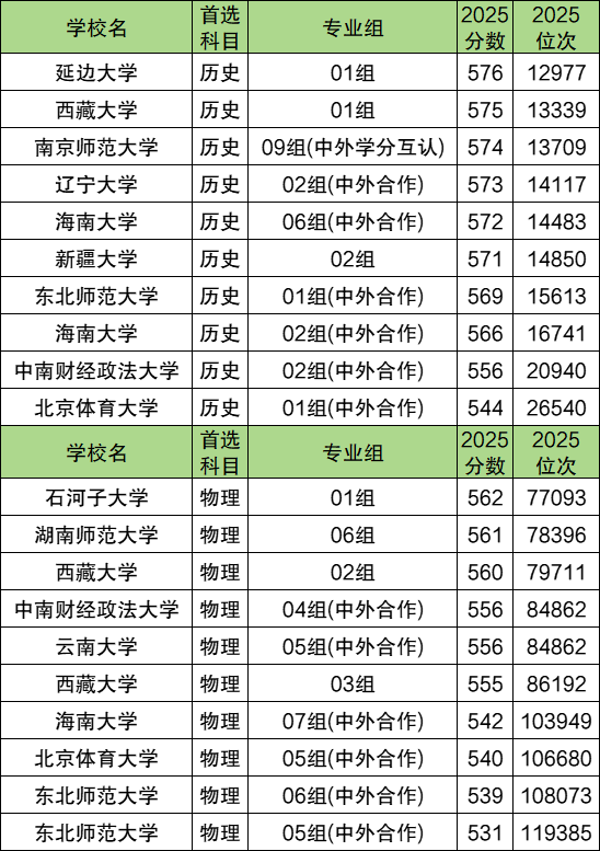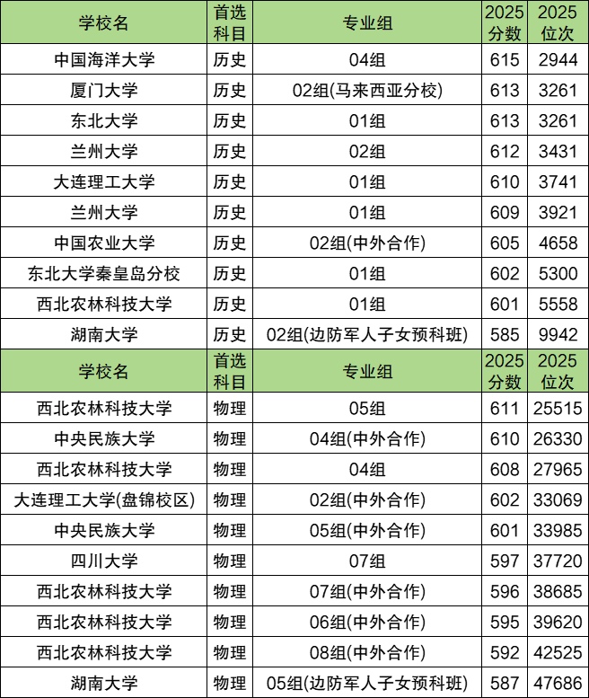 历史类:最低录取成绩585分,对应的学校是湖南大学。另外西北农林科技大学01组分数线也较低,601分,对应省排位5558名。