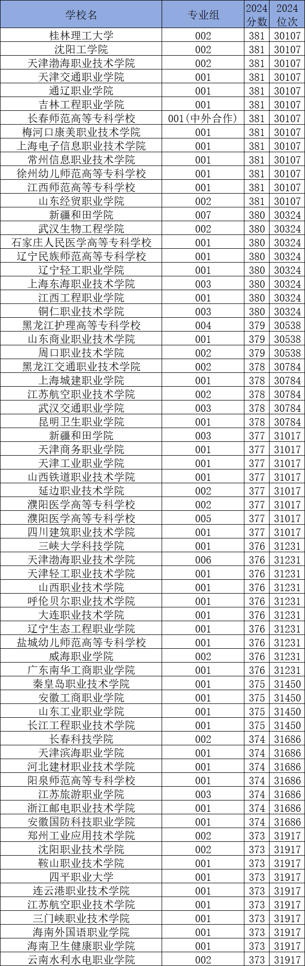 录取分数线最低的是云南水利水电职业学院002组、海南卫生健康职业学院001组等10个院校专业组,最低分为373分,最低位次31917位。