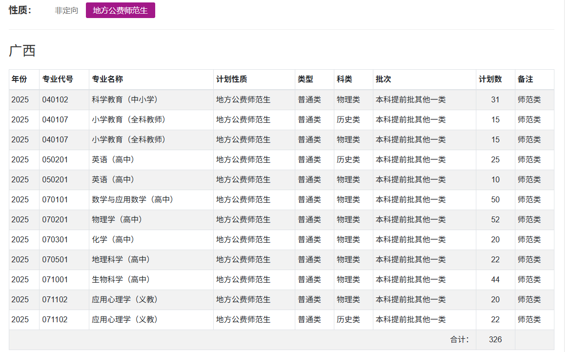 各校招生计划可在院校官网查询,如广西师范大学2025年公费师范生招生计划为326人,其中英语专业35名、小学教育专业30名、化学专业20名、生物科学专业44名等。招生计划表如下: