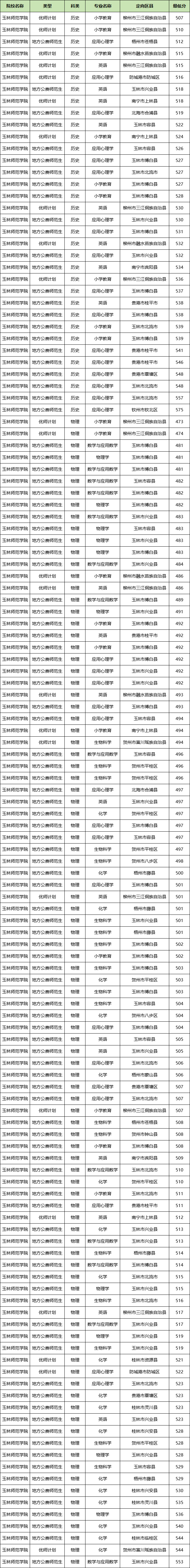玉林师范学院:历史类最低分507分、物理类最低分473分。