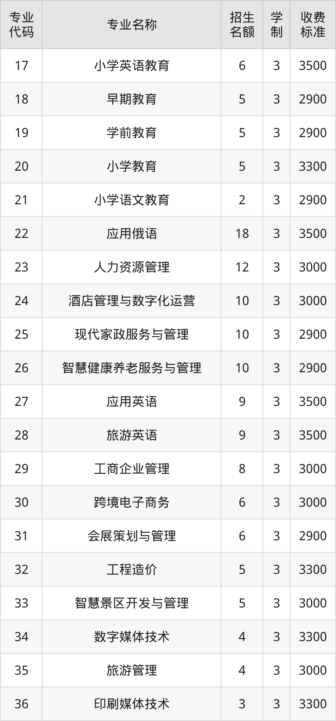 | 专业 代码 | 专业名称 | 招生 名额 | 学 制 | 收费 标准 |