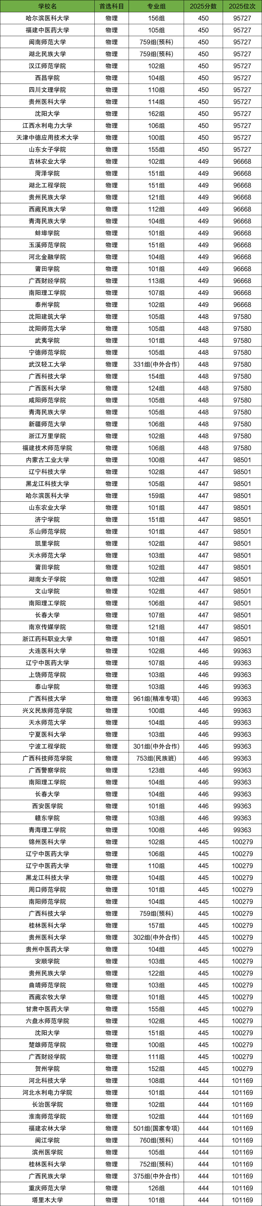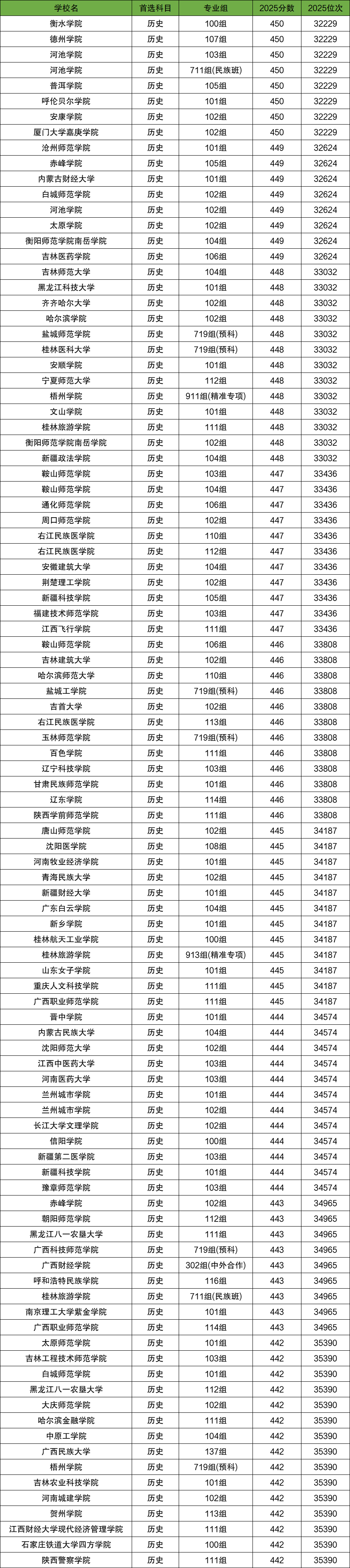 从2025年广西高考录取分数线为400到450分的统计表中看出: