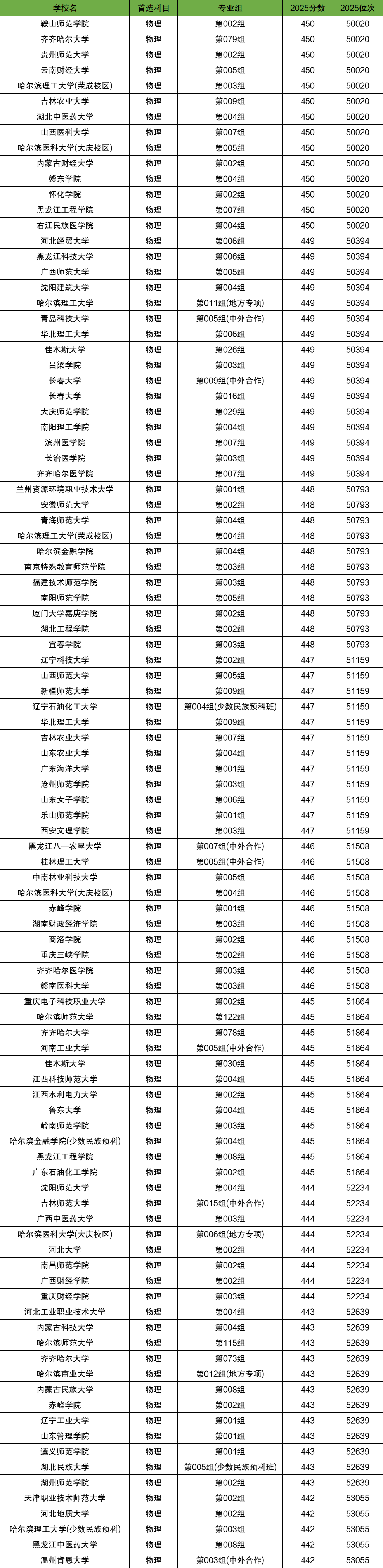 从2025年全国各本科学校在黑龙江的物理类录取分数为400到450分的统计表中可以得到一些信息:400到450分的二本大学中,收分最低的二本大学有四川传媒学院第003组400分、湖北商贸学院第002组400分,收分较高的二本大学有鞍山师范学院第002组450分、齐齐哈尔大学第079组450分、贵州师范大学第002组450分等。具体如下表:(本文篇幅有限,仅列举分数前100院校专业组)