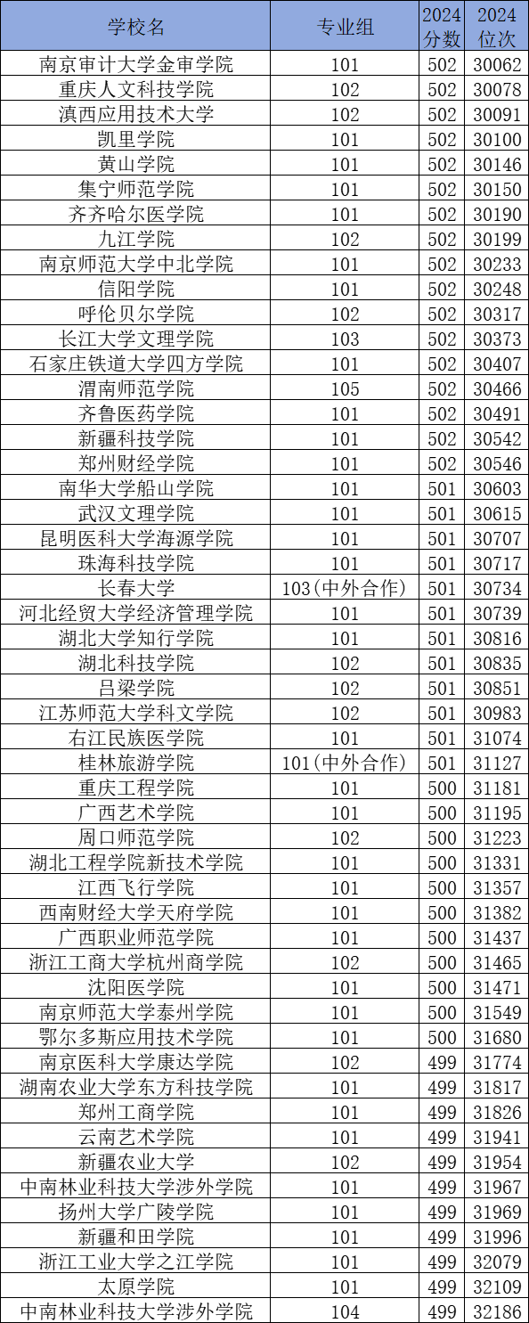 在这个范围内,录取分数线最高的是南京审计大学金审学院101组、重庆人文科技学院102组等17个院校专业组,最低分为502分,最低位次30062位;