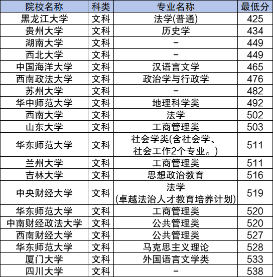 新疆高校专项计划文科录取分数最低的是黑龙江大学法学(普通)专业,2024年最低分为425分;相对较低的还有贵州大学(历史学434分)、湖南大学(449分)、西北大学(449分)等。