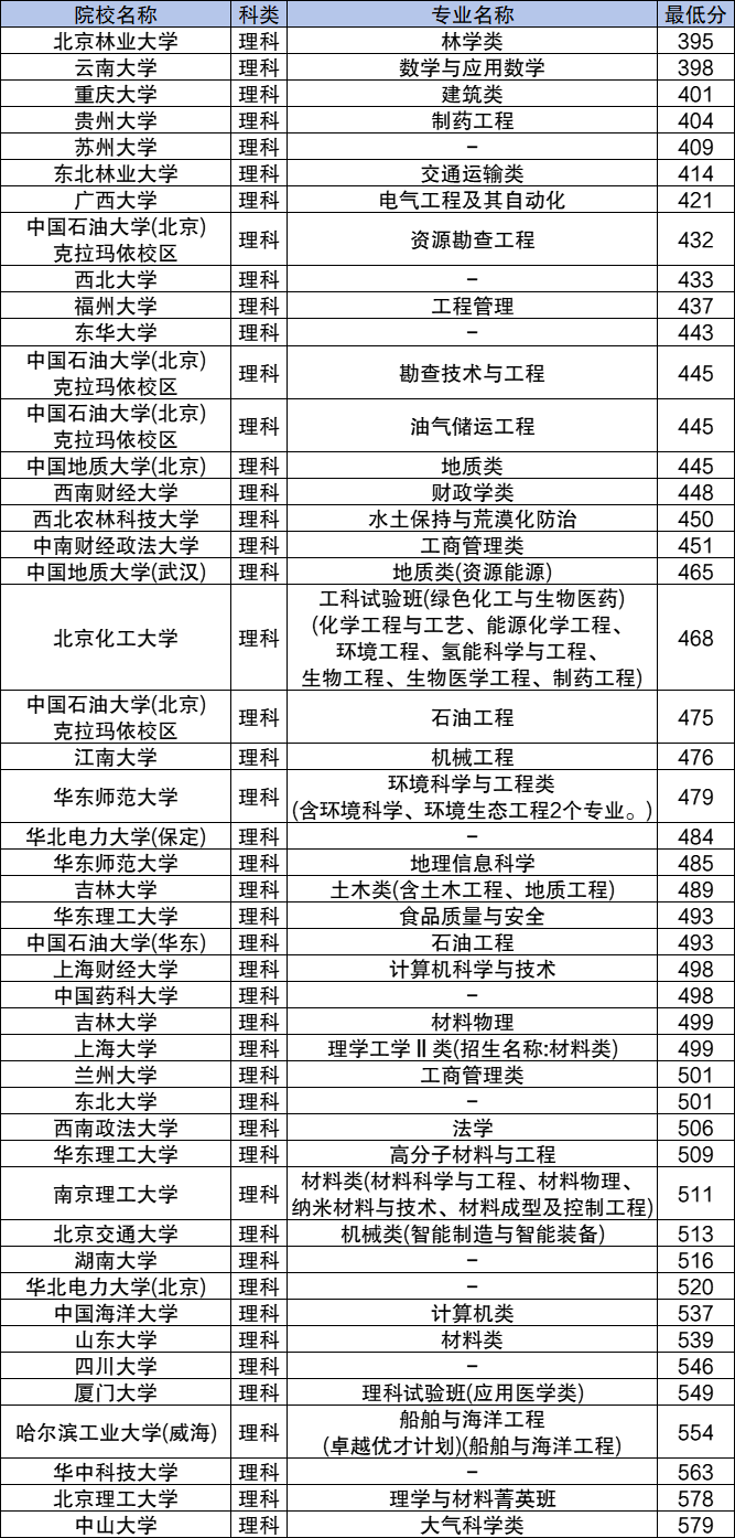 2024年各大学高校专项计划在新疆理科的招生专业要多于文科,理科各大学高校专项计划各专业的录取分数线在395分-579分之间;录取分数最高的是中山大学大气科学类,最低分为579分;录取分数最低的是北京林业大学林学类,2024最低分为395分。